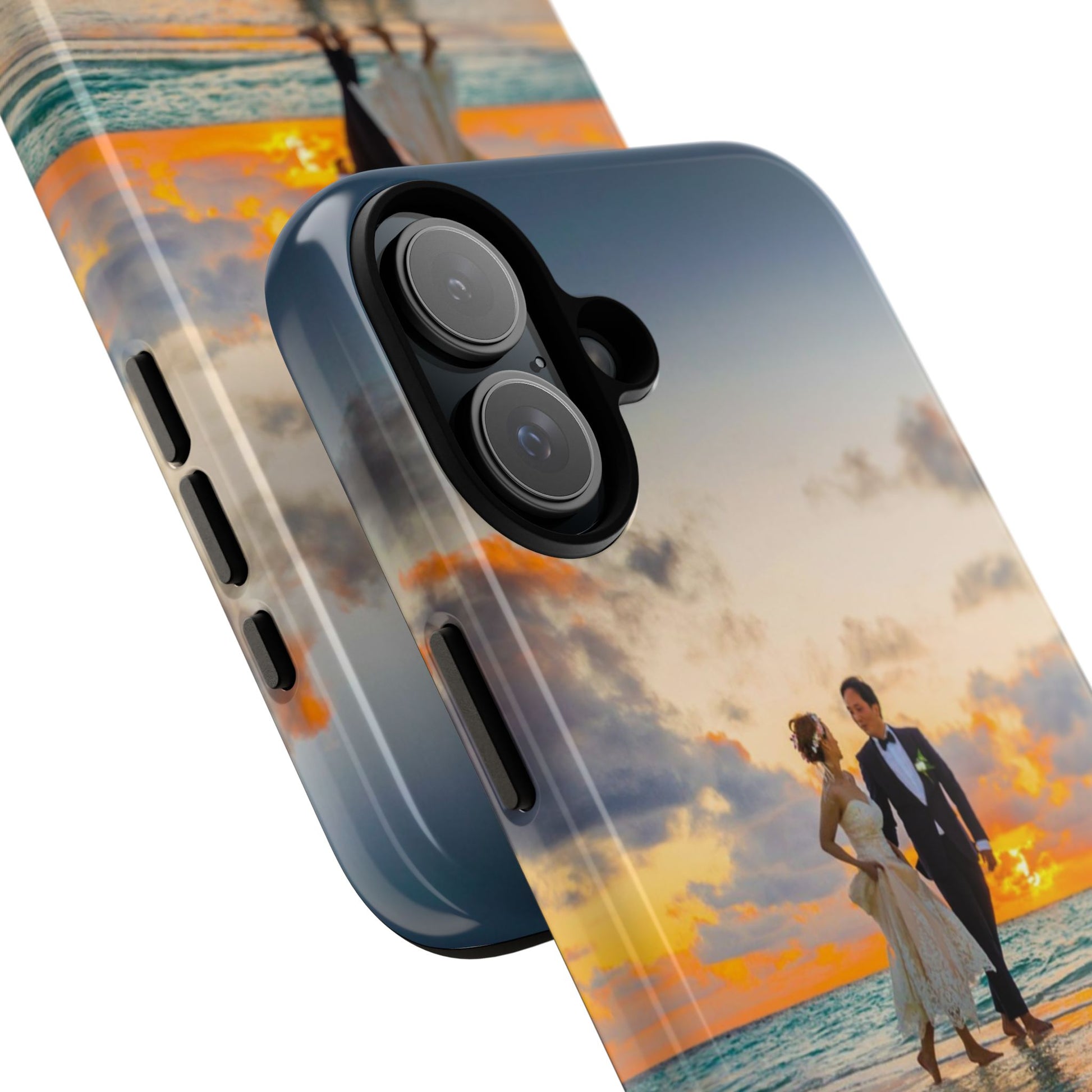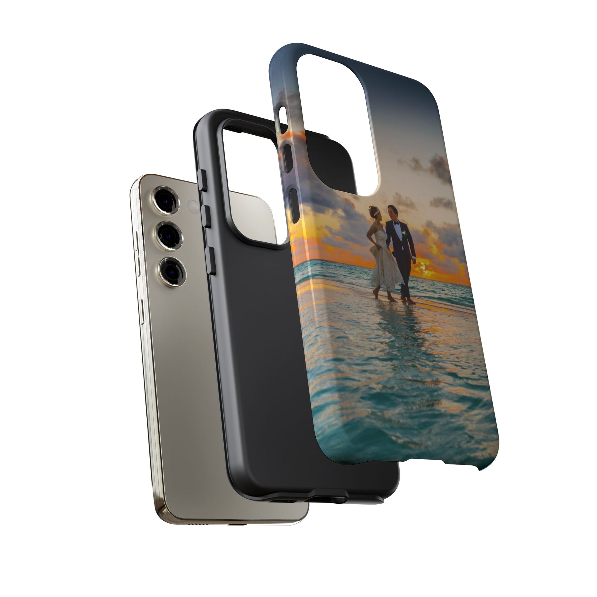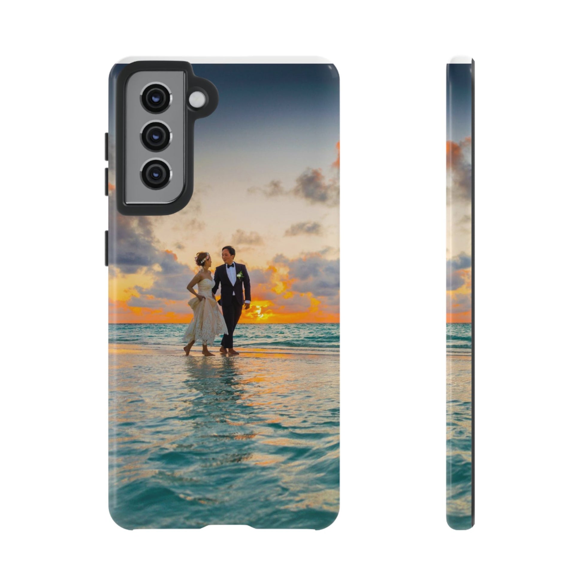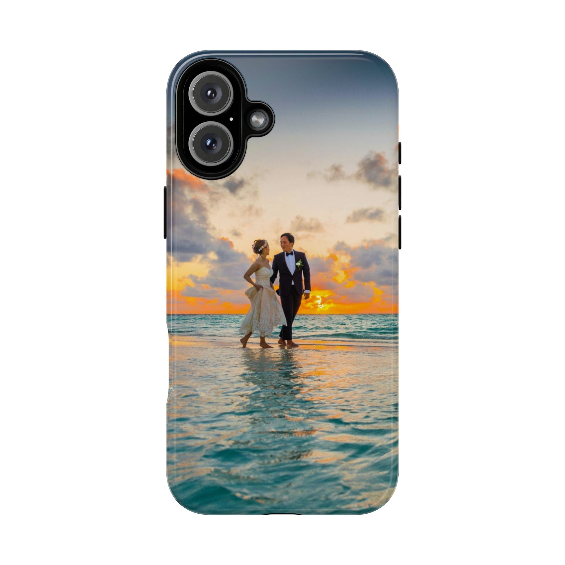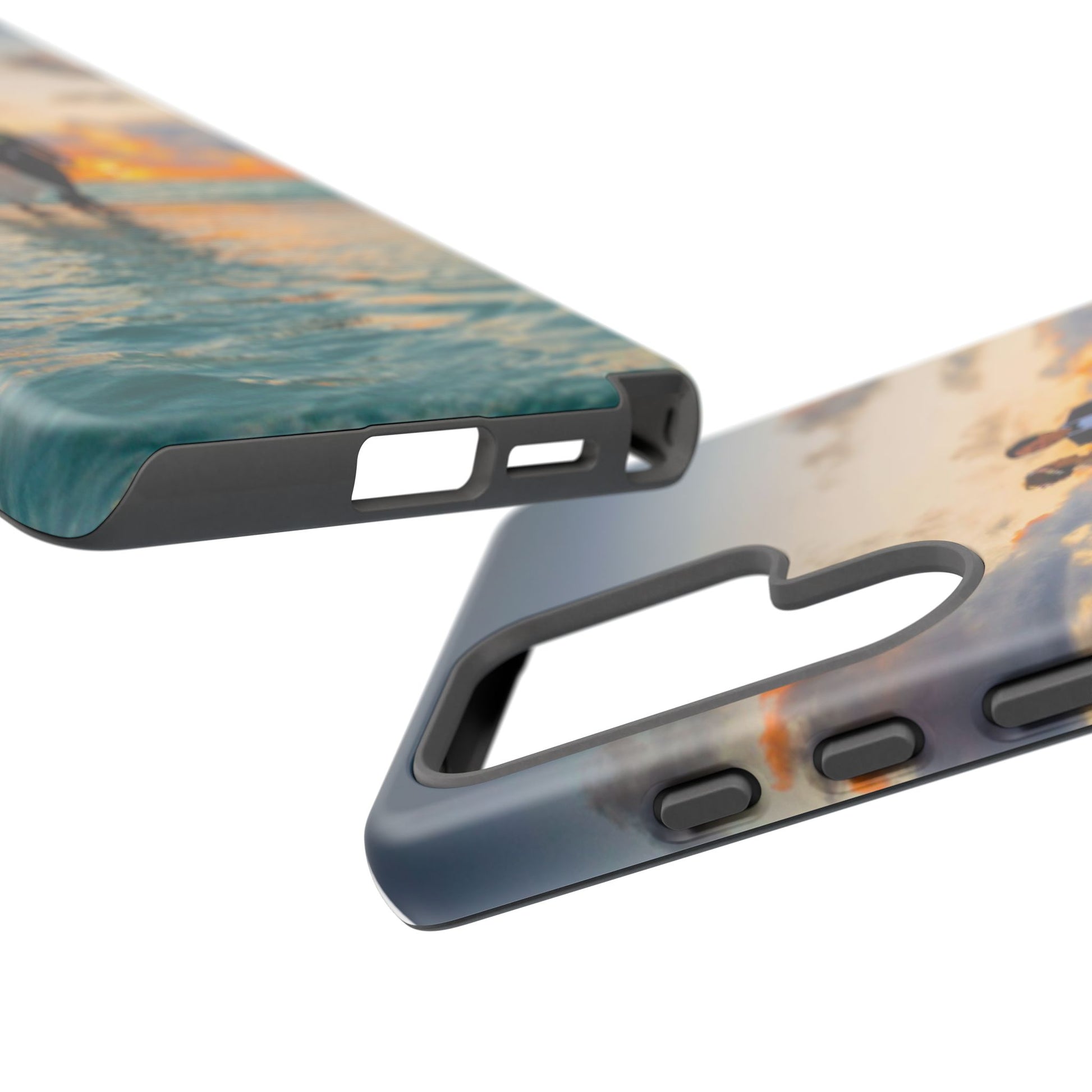 This slim, dual-layer phone case carries a sunlit moment from shore to pocket. A full-wrap print captures a couple walking at sunset, the ocean’s turquoise ripples flowing around the camera cutout and the warm sky fading into the glossy edges. The inner TPU liner cushions against drops while the rigid polycarbonate shell resists impacts and keeps the image vibrant. It slips easily into a bag, stands up to daily life, and keeps charging ports open so you can go from sunset strolls to late-night calls without fuss.