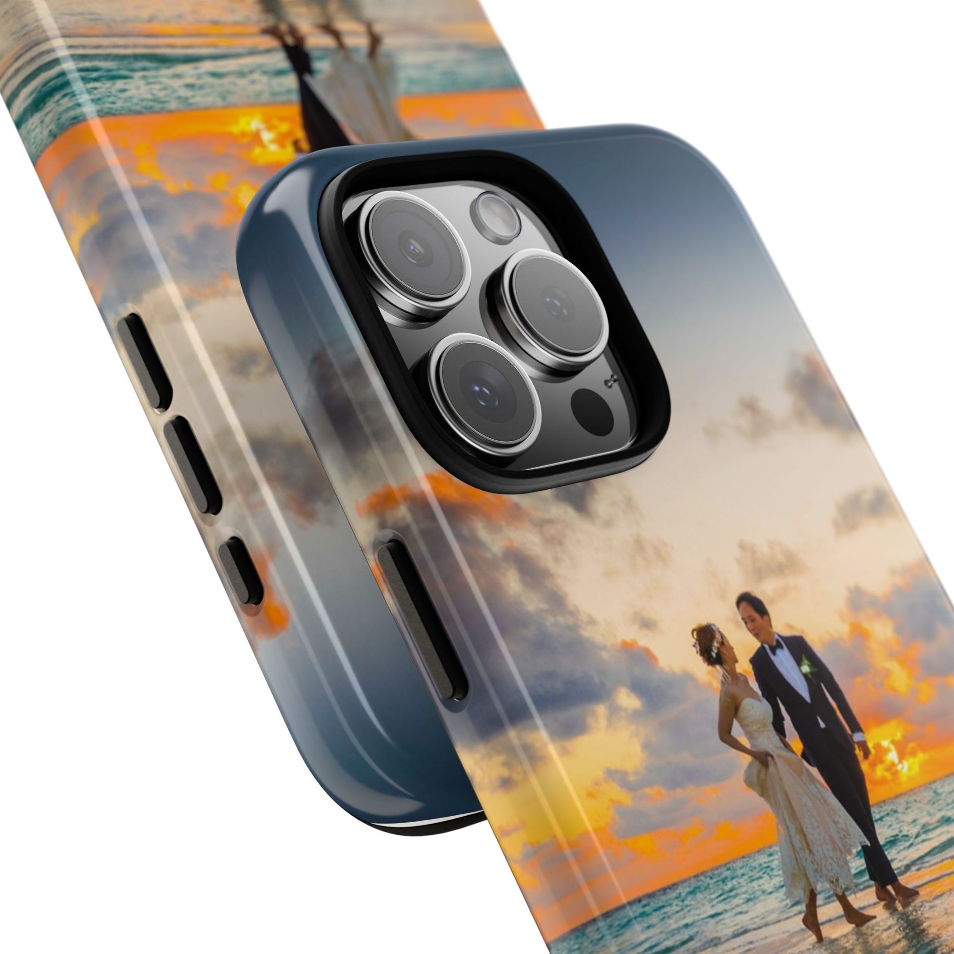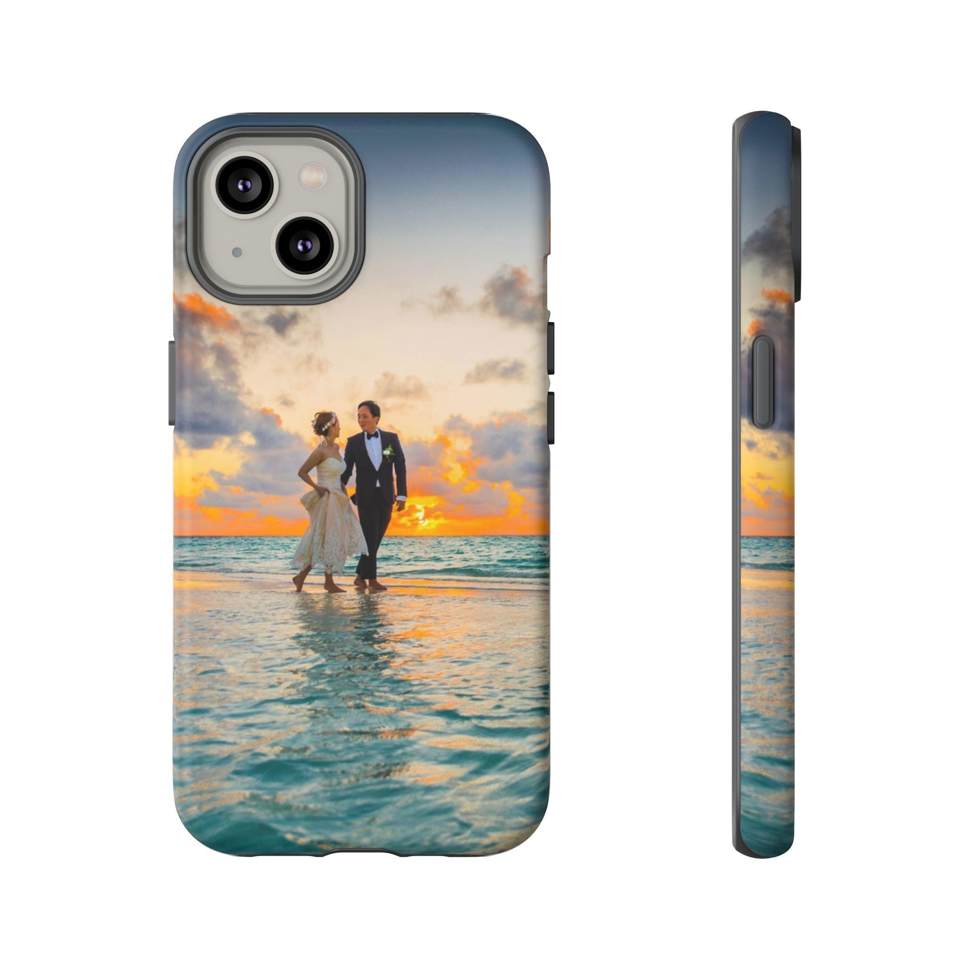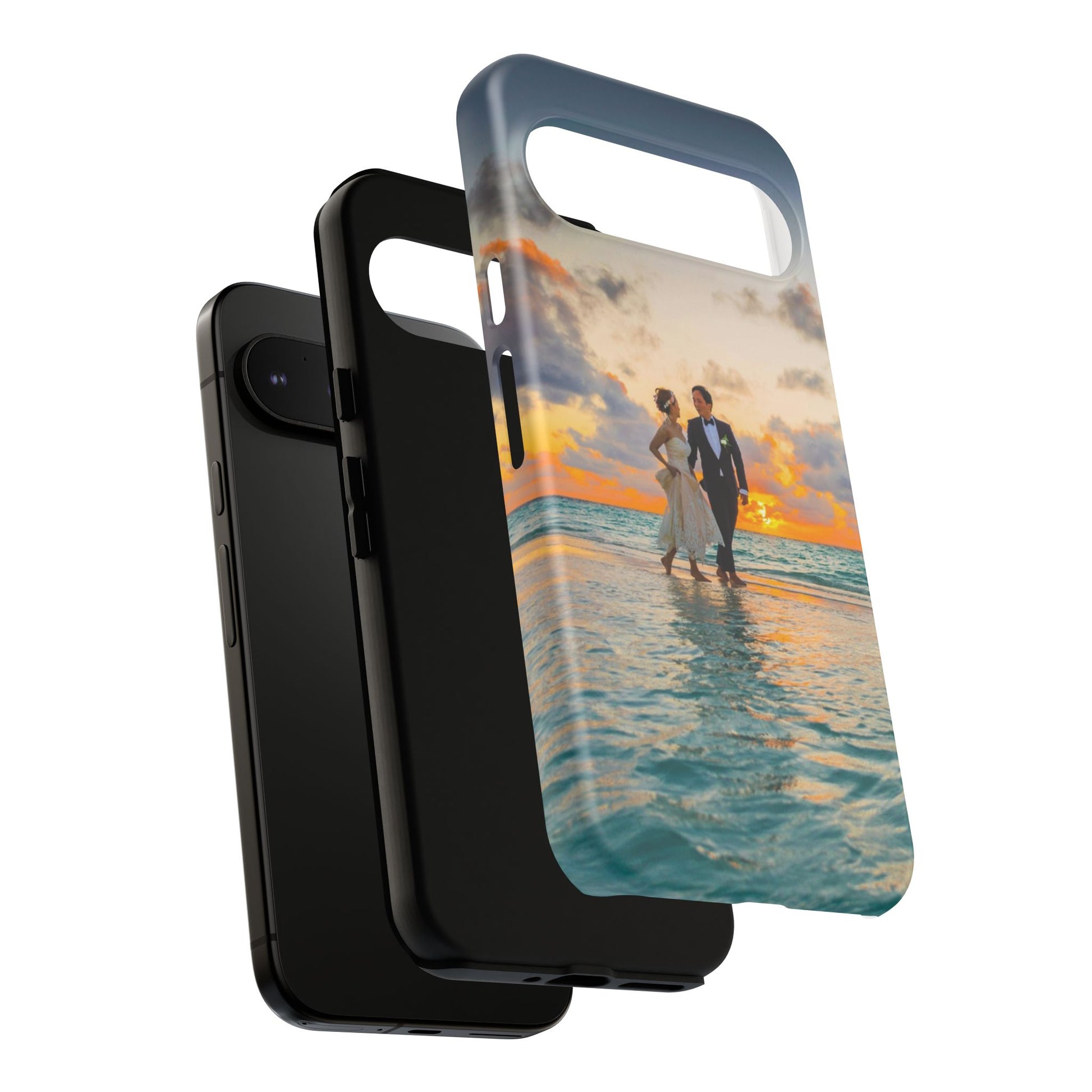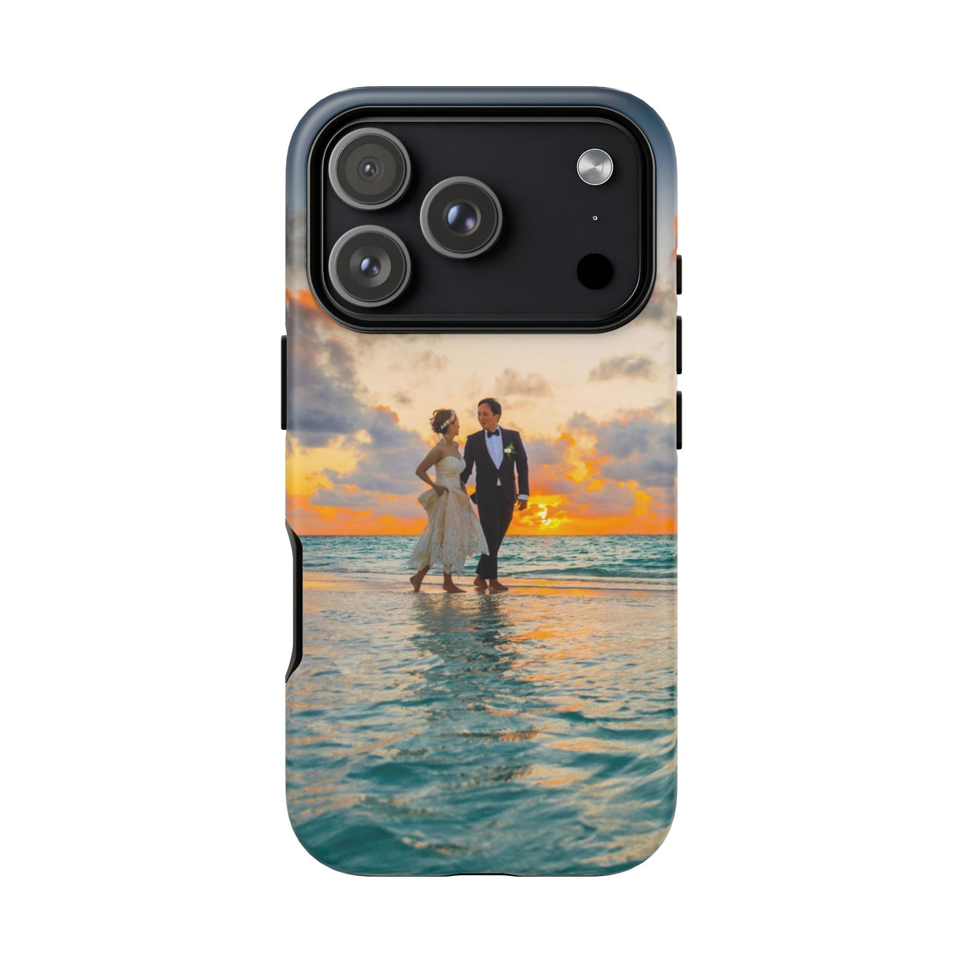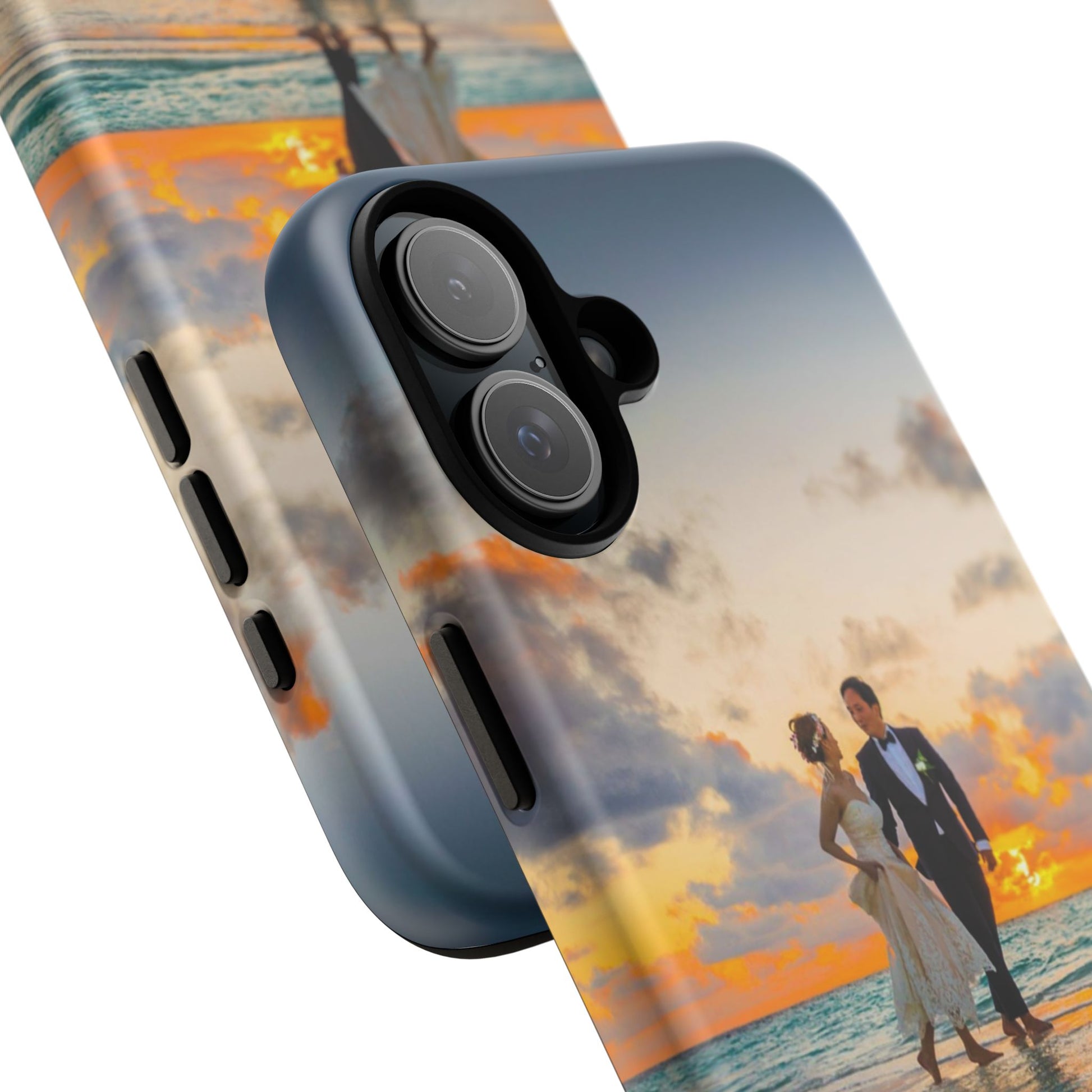 This slim, dual-layer phone case carries a sunlit moment from shore to pocket. A full-wrap print captures a couple walking at sunset, the ocean’s turquoise ripples flowing around the camera cutout and the warm sky fading into the glossy edges. The inner TPU liner cushions against drops while the rigid polycarbonate shell resists impacts and keeps the image vibrant. It slips easily into a bag, stands up to daily life, and keeps charging ports open so you can go from sunset strolls to late-night calls without fuss.