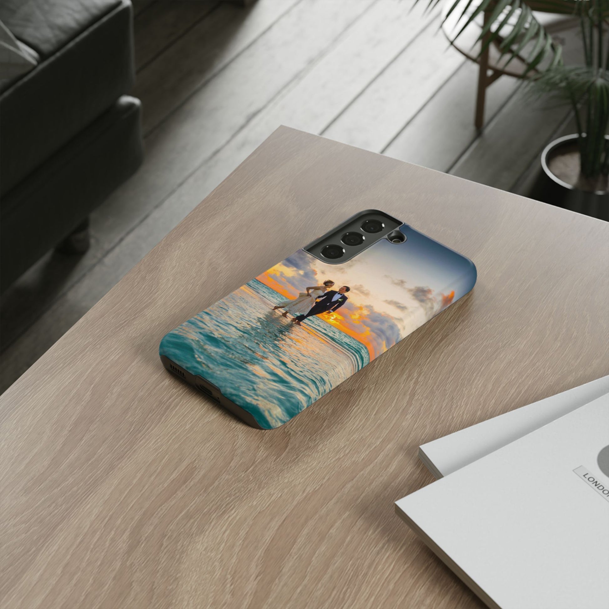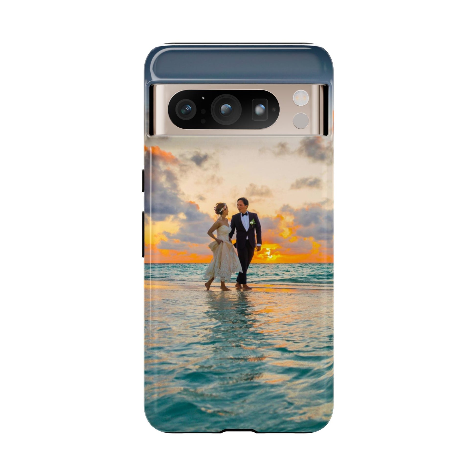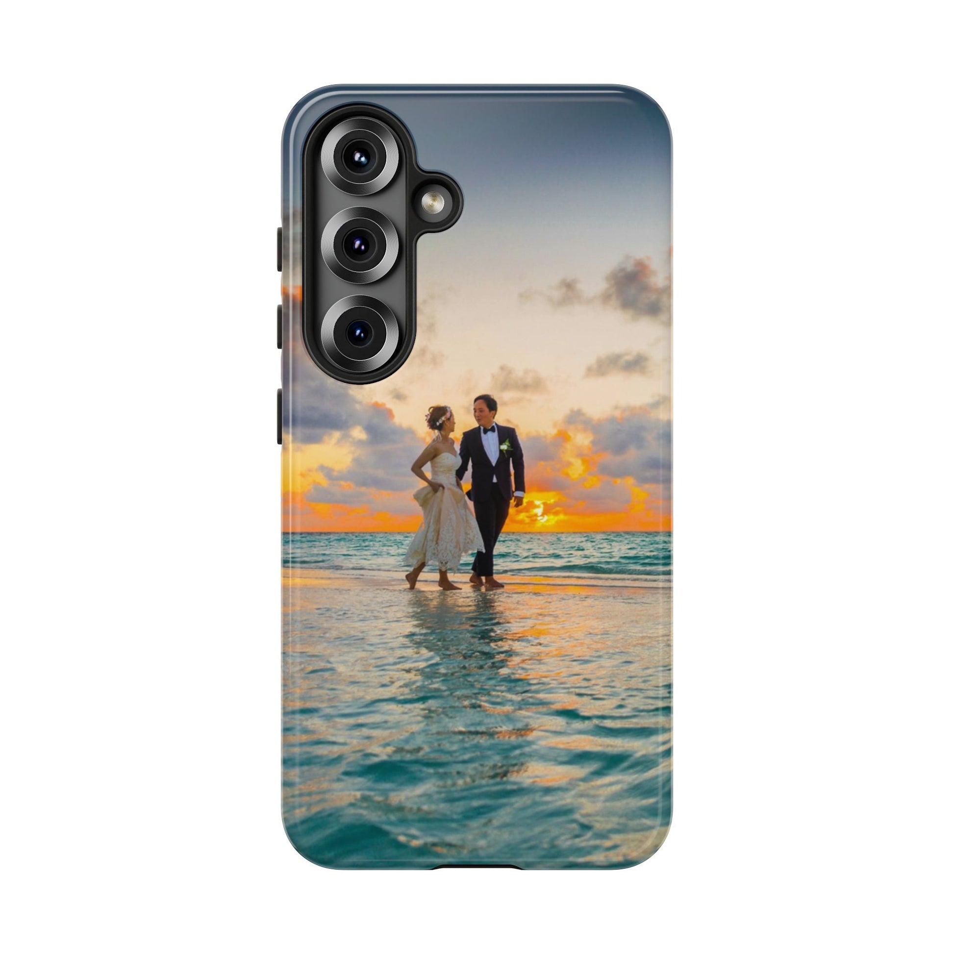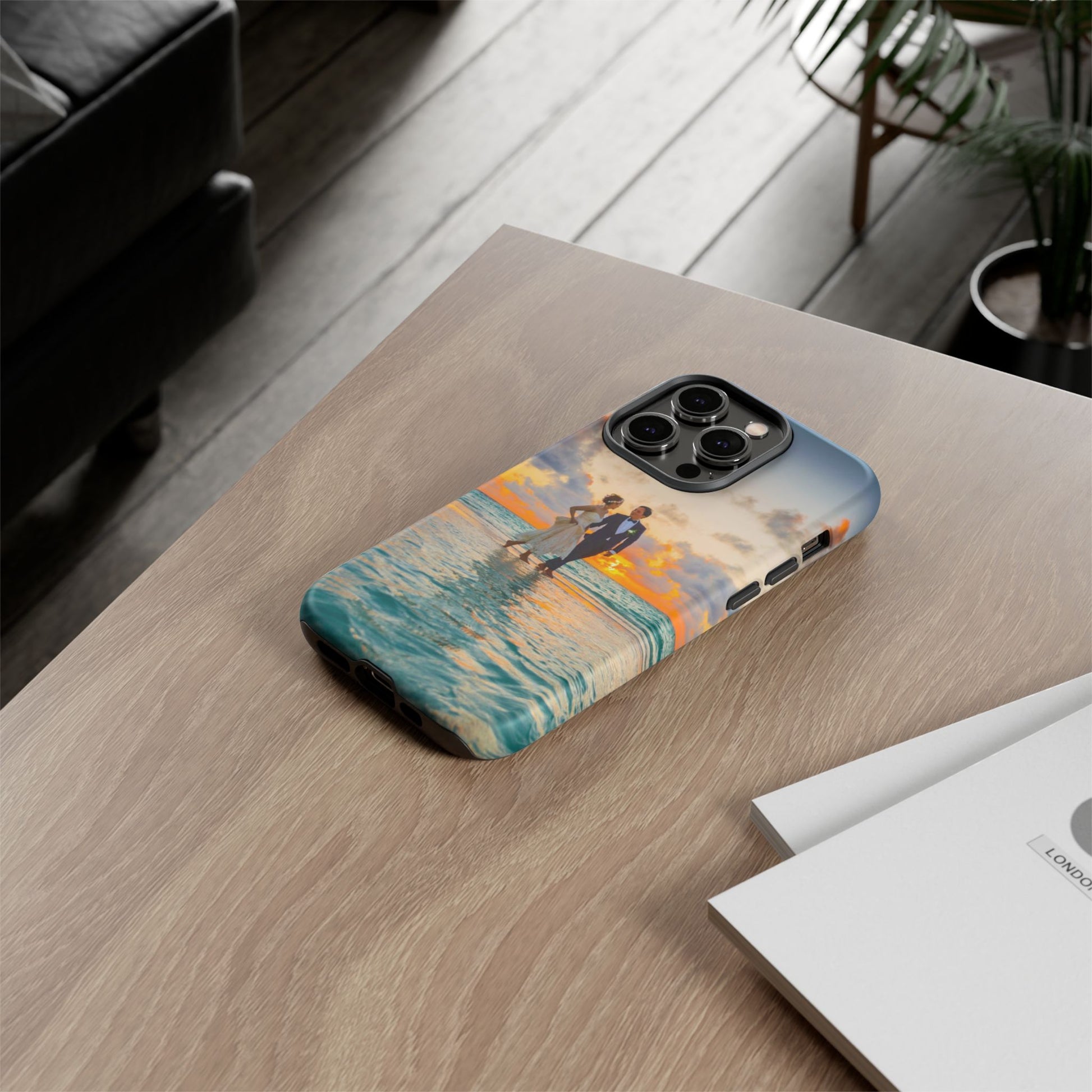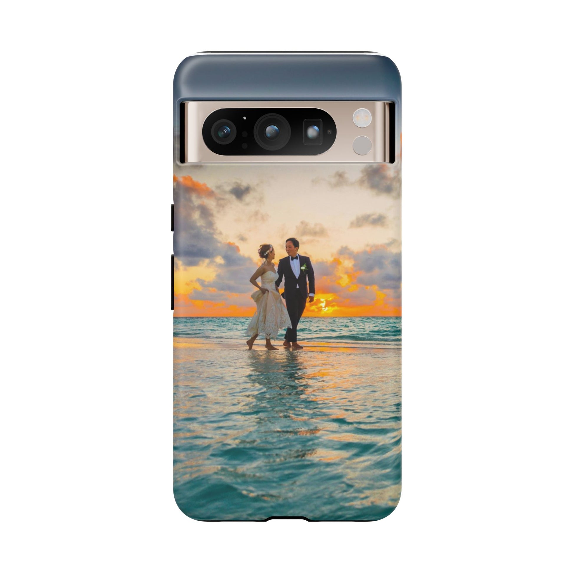 This slim, dual-layer phone case carries a sunlit moment from shore to pocket. A full-wrap print captures a couple walking at sunset, the ocean’s turquoise ripples flowing around the camera cutout and the warm sky fading into the glossy edges. The inner TPU liner cushions against drops while the rigid polycarbonate shell resists impacts and keeps the image vibrant. It slips easily into a bag, stands up to daily life, and keeps charging ports open so you can go from sunset strolls to late-night calls without fuss.