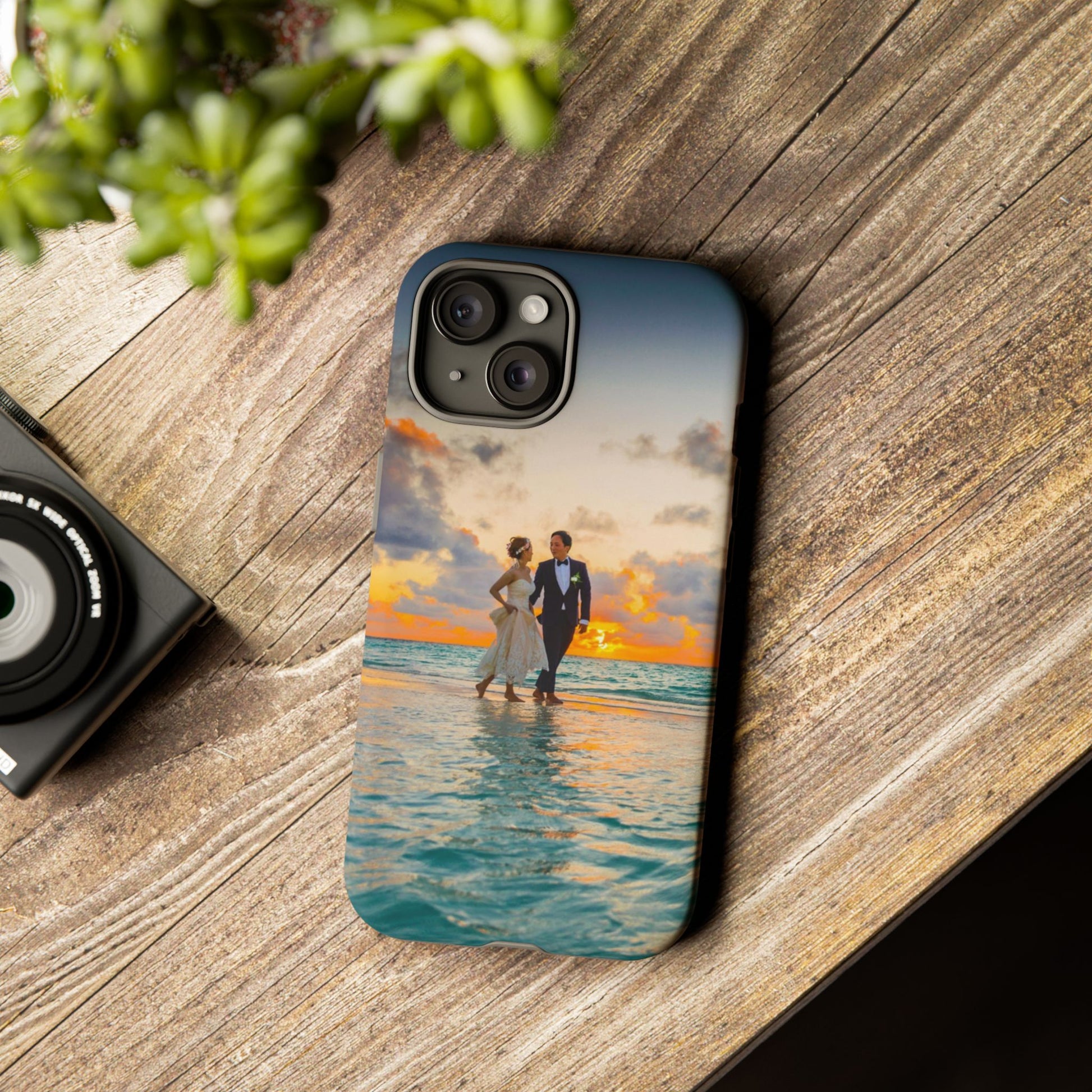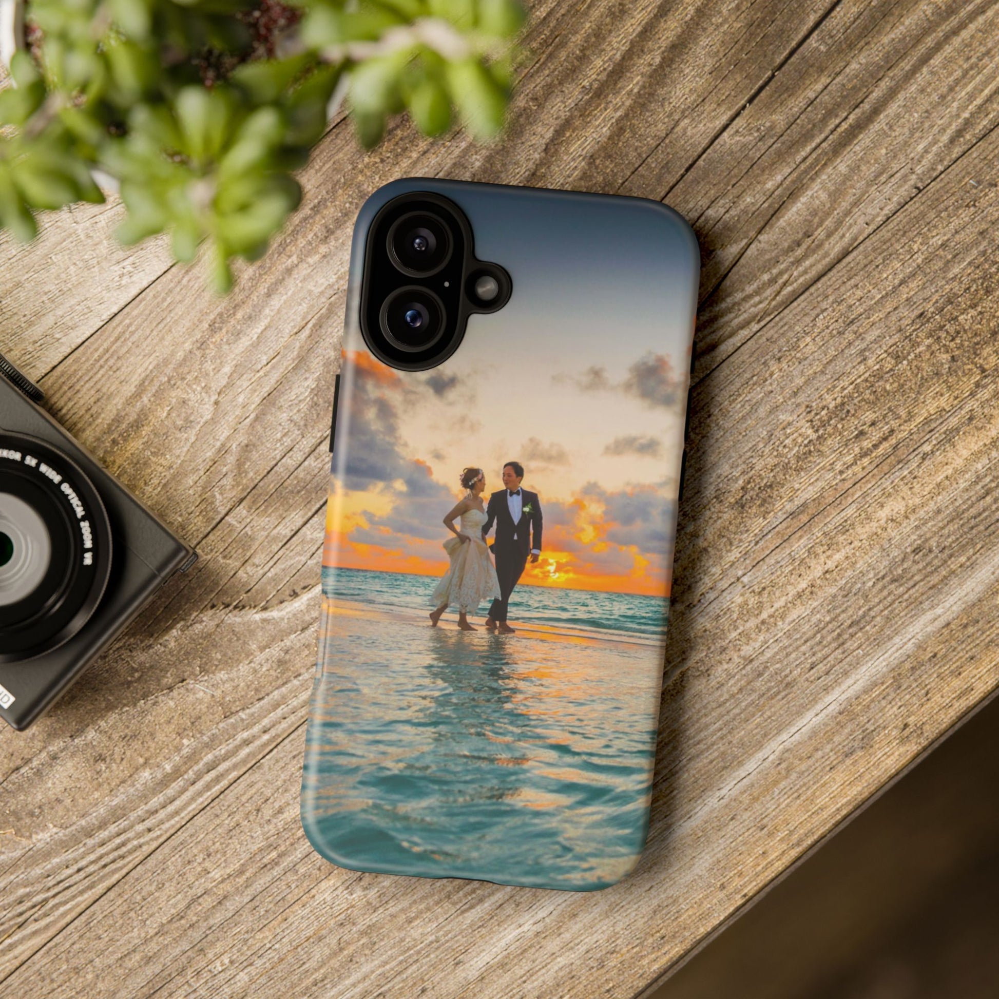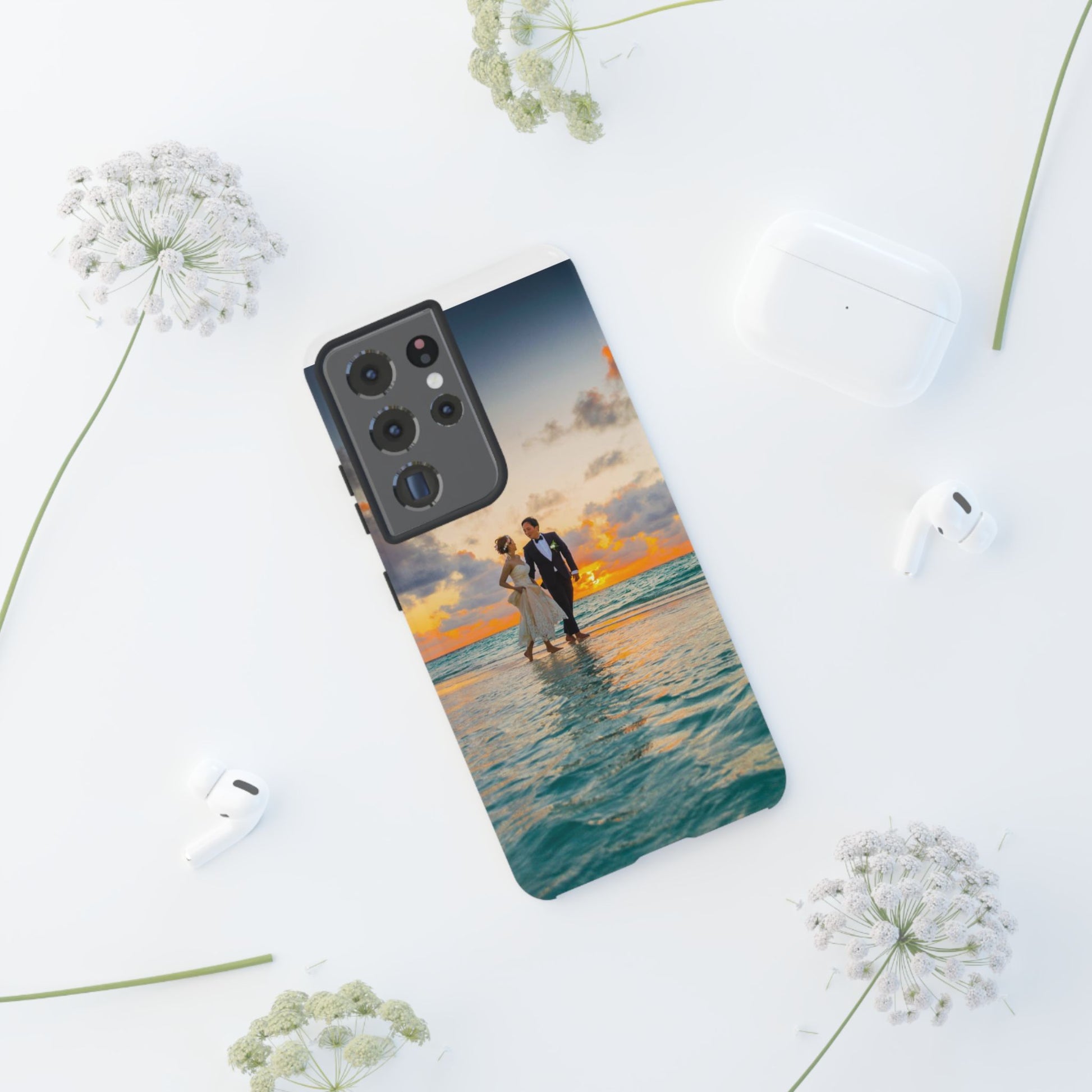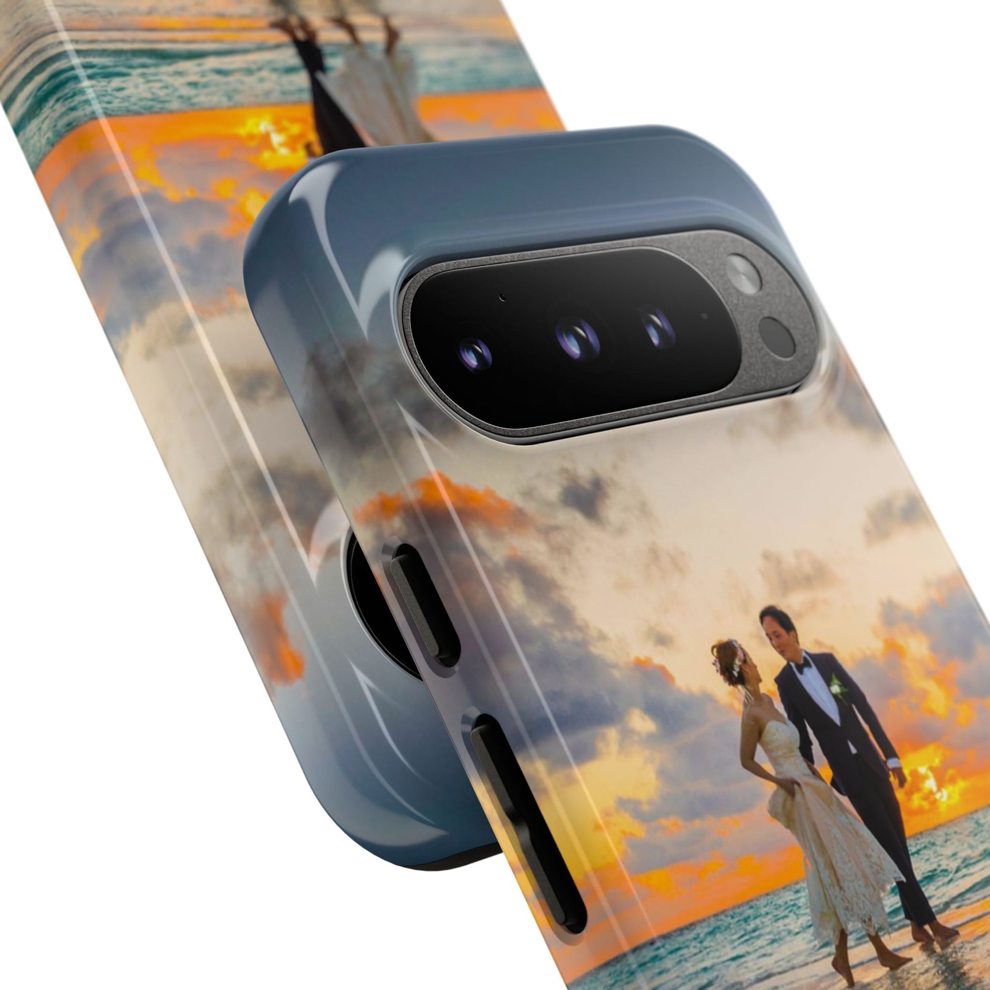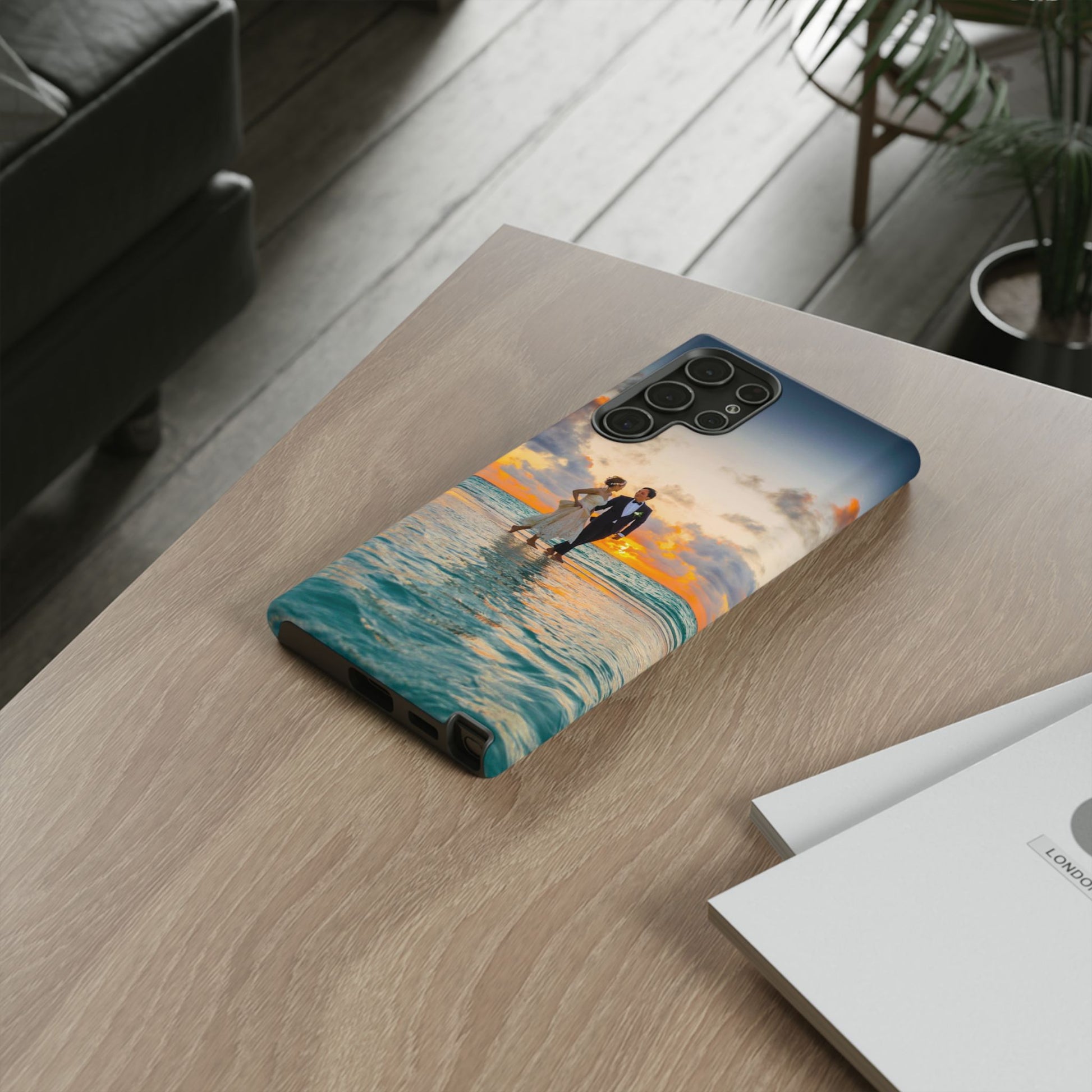 This slim, dual-layer phone case carries a sunlit moment from shore to pocket. A full-wrap print captures a couple walking at sunset, the ocean’s turquoise ripples flowing around the camera cutout and the warm sky fading into the glossy edges. The inner TPU liner cushions against drops while the rigid polycarbonate shell resists impacts and keeps the image vibrant. It slips easily into a bag, stands up to daily life, and keeps charging ports open so you can go from sunset strolls to late-night calls without fuss.
